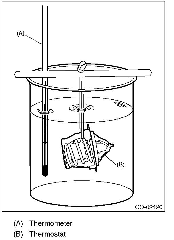 3) Immerse the thermostat and a thermometer in water. Raise water temperature gradually, and check the temperature and valve lift when the valve begins to open and when the valve is fully opened. Replace the thermostat if faulty.