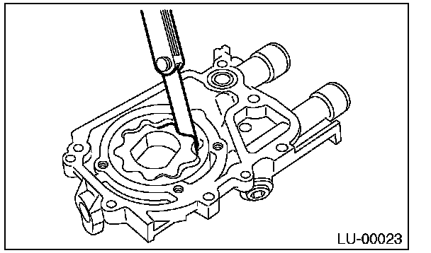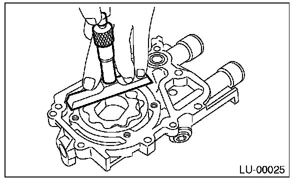 Measure the gap between the inner rotor and the oil pump case to measure the clearance between the inner rotor and the oil pump cover as shown in the figure. If clearance is out of standard, replace the rotor or the oil pump case.