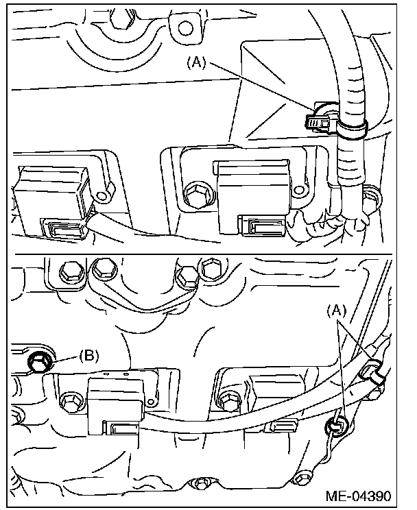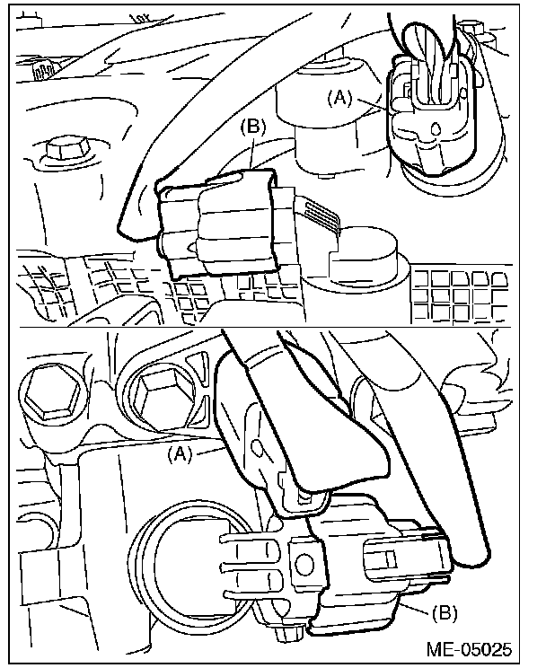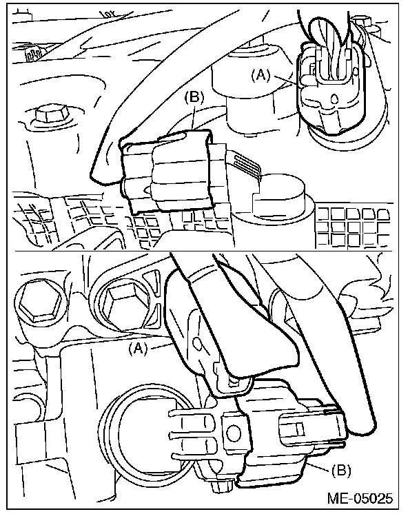7) Disconnect the connector (A) from the exhaust camshaft position sensor and the connector (B) form the exhaust oil flow control solenoid valve.