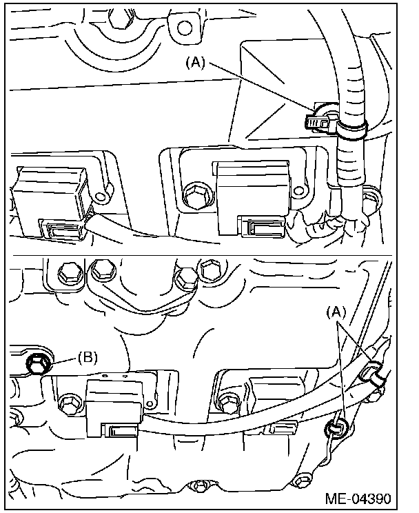 14) Disconnect PCV hose (A) and vacuum hose (B) from the rocker cover.
