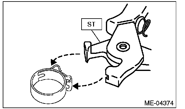 Use a new clamp for the PCV hose (A), fit the cut out in the ST with the protrusion on the clamp as shown in the figure, and lock the clamp.