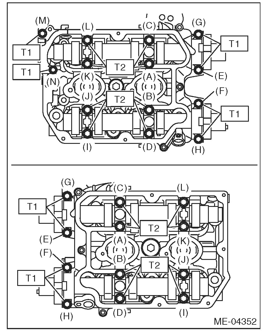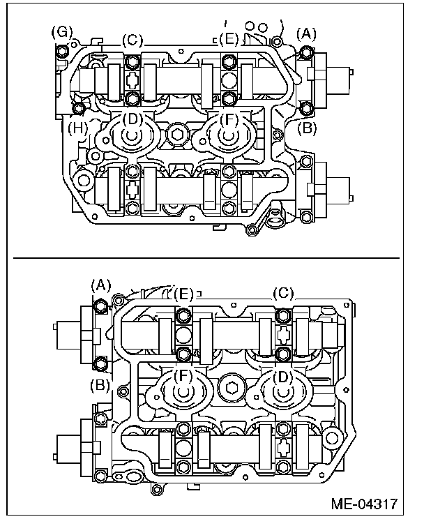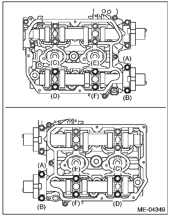 (4) Gradually tighten the camshaft cap in at least two steps, in alphabetical order shown in the figure, and then tighten to the specified torque. Do not turn the camshaft.