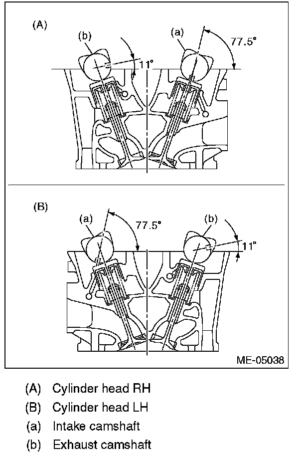 ^ When set at the position shown in the figure, it is not necessary to rotate the camshaft RH when installing the timing belt, but it is necessary to rotate the camshaft LH slightly.