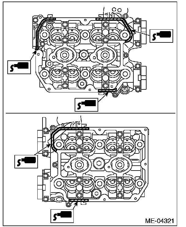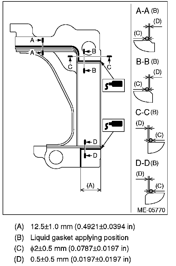 ^ Do not apply liquid gasket excessively. Applying excessively may cause excess gasket to come out and flow toward oil seal, resulting in oil leak.