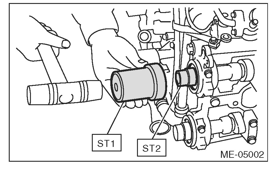 3) Apply a thin coat of engine oil to the periphery of the camshaft oil seal and oil seal lip, and install the oil seal on the camshaft using ST1 and ST2.