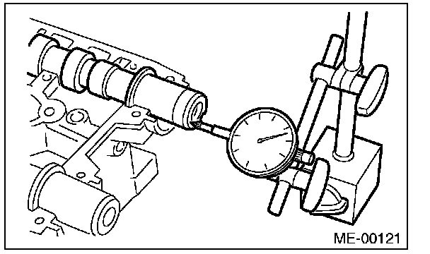 8) Measure the thrust clearance of camshaft with the dial gauge set at end of camshaft. If the thrust clearance is not within the standard or there is offset wear, replace the camshaft caps and cylinder head as a set. If necessary replace the camshaft.