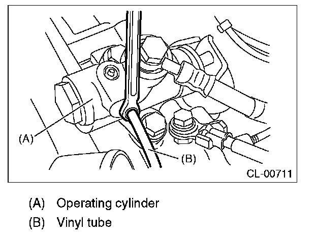 4) Fit one end of a vinyl tube into the air breather of the operating cylinder, and put the other end into a clutch fluid container.