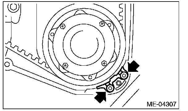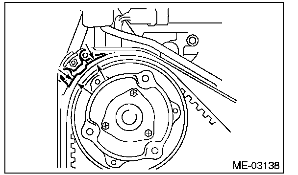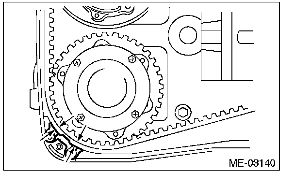 (2) Using white paint, put an alignment mark or an arrow mark on timing belts in relation to the crank sprocket and cam sprockets.