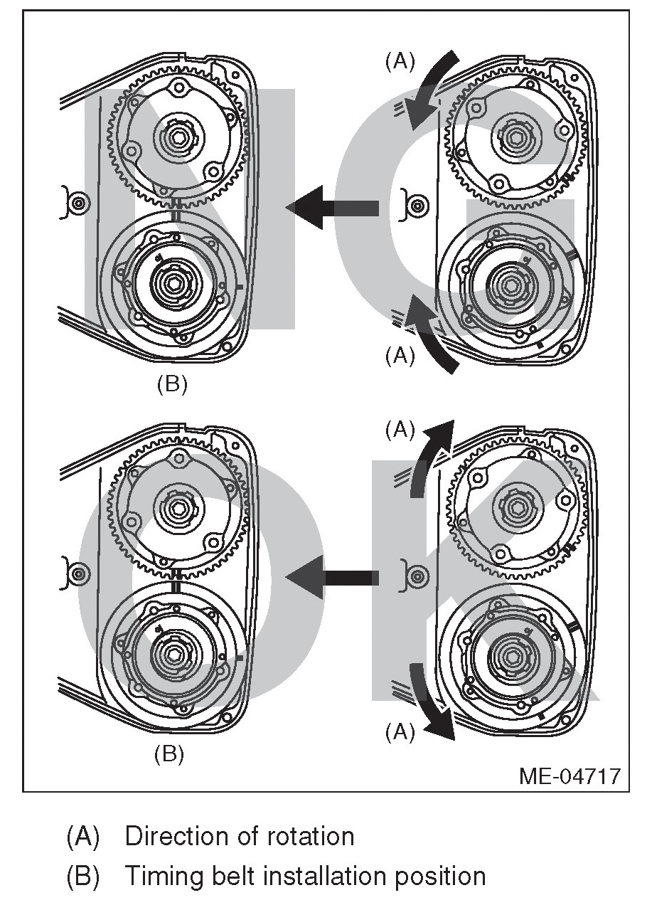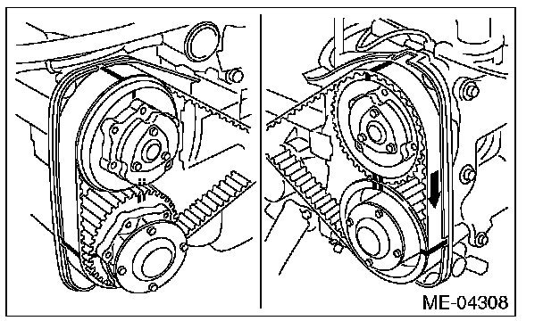 4) If the alignment mark or arrow mark (which indicates the direction of rotation) on timing belt fade away, put new marks before removing the timing belt as shown in procedures below.