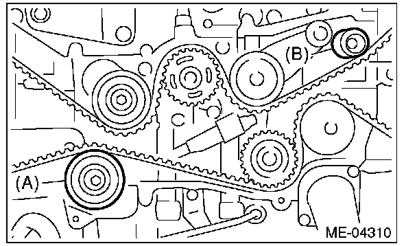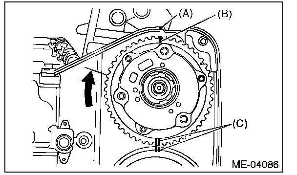 4) Align the single line mark (B) on the intake cam sprocket RH with notch (A) on the timing belt cover. Make sure that the double line marks (C) on intake and exhaust cam sprockets are aligned.