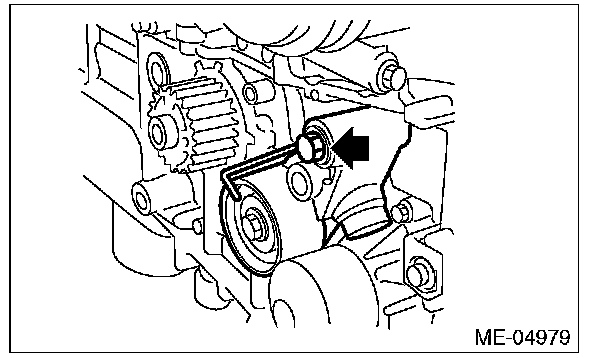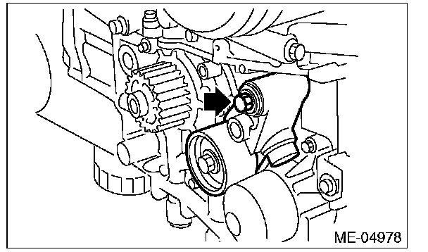 10) After ensuring that the marks on the timing belt and sprockets are aligned, remove the stopper pin from tensioner adjuster.