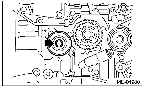 ^ Apply liquid gasket to the thread of the timing belt guide mounting bolt on the cam sprocket section. (when reusing bolts)