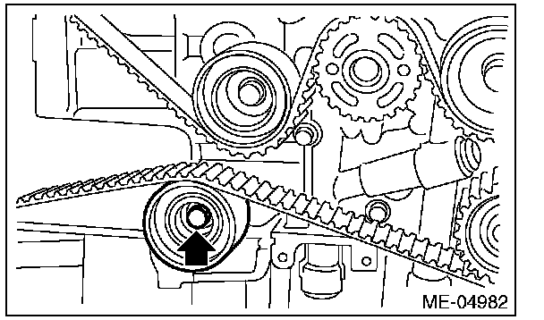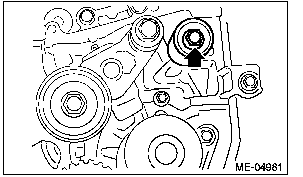 2) Check the belt tension pulley for smooth rotation. Replace the automatic belt tension adjuster assembly with a new part if abnormal noise or excessive play occurs.