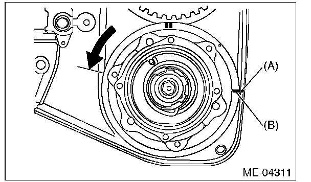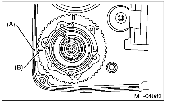 5) Align the single line mark (B) on exhaust cam sprocket LH with notch (A) on the timing belt cover by turning the sprocket counterclockwise (as viewed from front of engine).