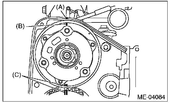 8) Align the alignment mark on the timing belt with marks on the sprockets in the alphabetical order shown in the figure. While aligning marks, position the timing belt properly, and install the timing belt.