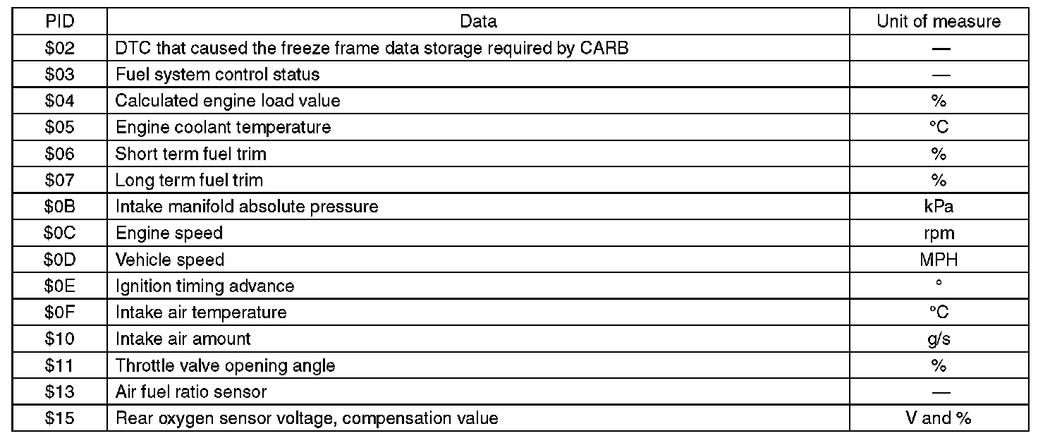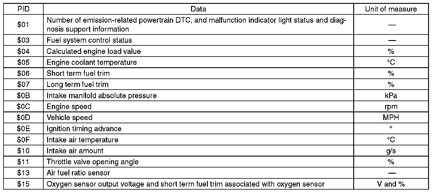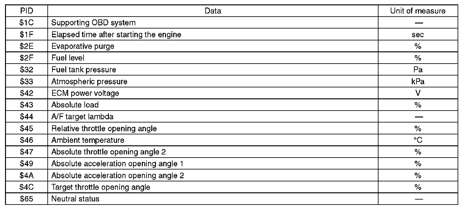 A list of the support data and PID (Parameter Identification) codes are shown in the following table.
