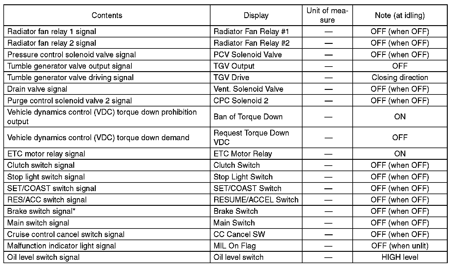 - *: For models without cruise control, the brake switch signal does not change.