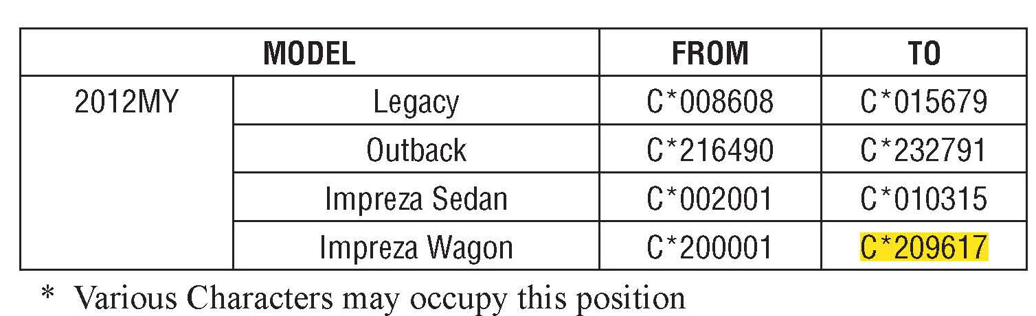 Potentially affected vehicles are identified in the VIN range chart. Note: Not all vehicles in the VIN range are affected. Prior to performing repairs, confirm coverage by using the Vehicle Coverage Inquiry function at Subarunet.com.
