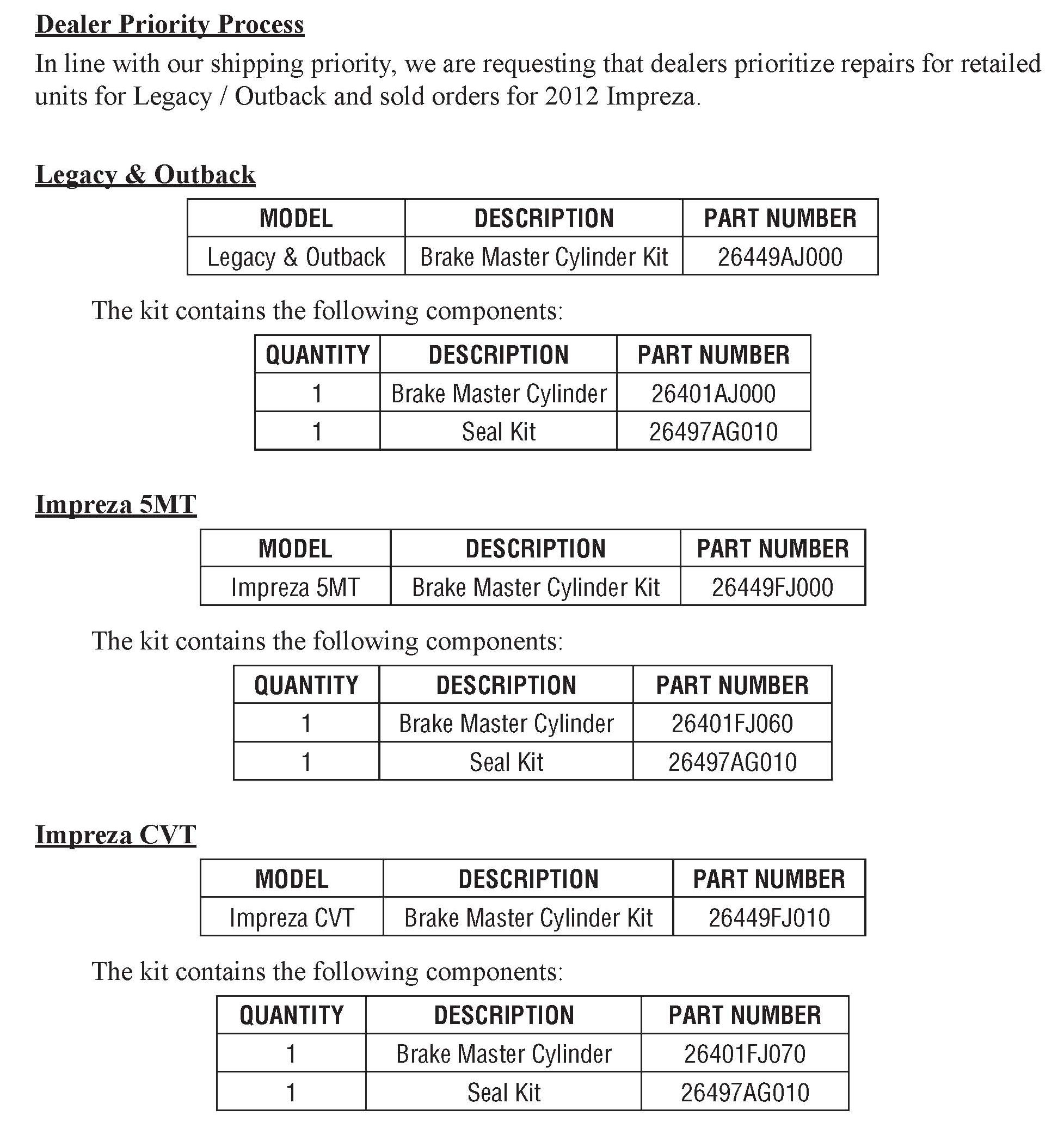 In line with our shipping priority, we are requesting that dealers prioritize repairs for retailed units for Legacy / Outback and sold orders for 2012 Impreza.