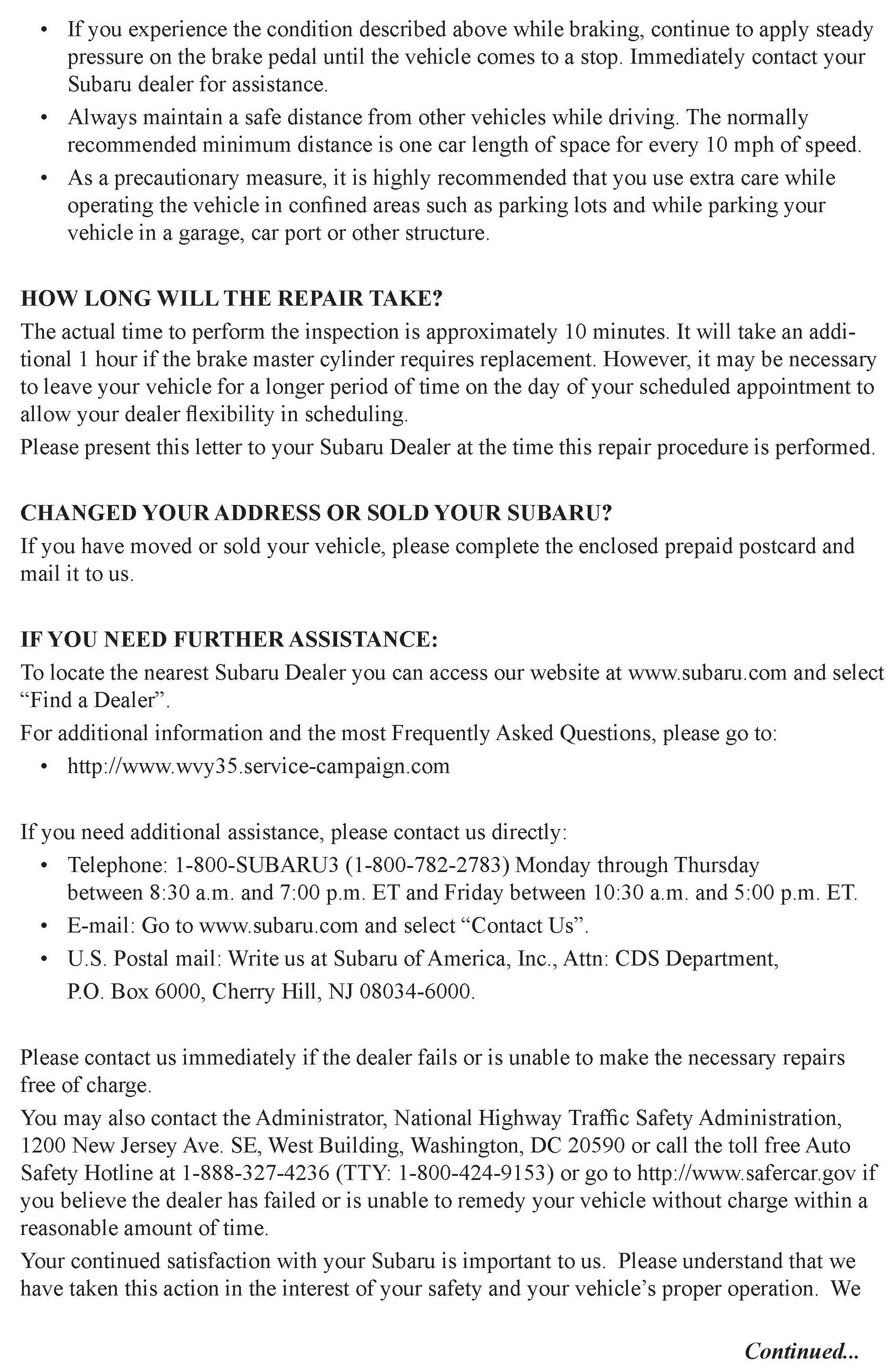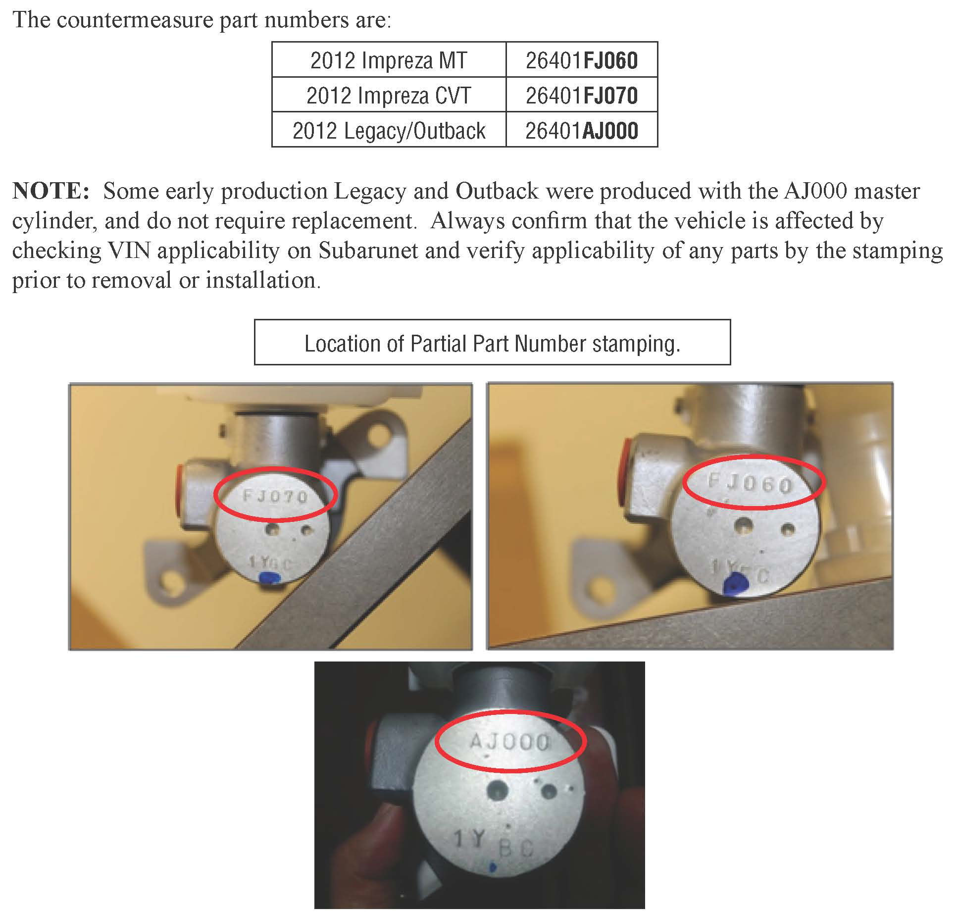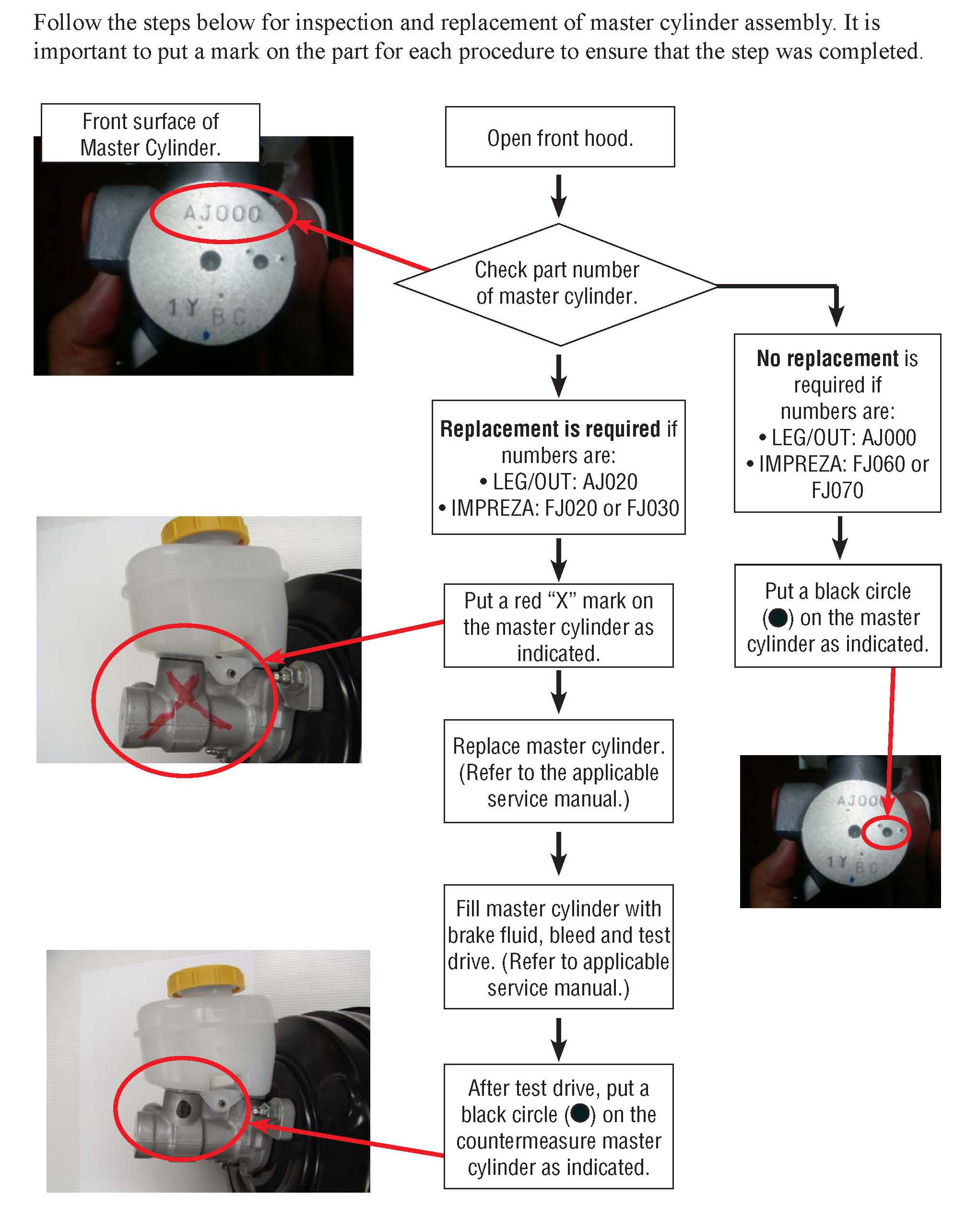The brake master cylinder must be replaced with a modified part as described. Follow the Subaru Service Manual for the specific model vehicle for instructions Follow all safety and technical practices, etc.