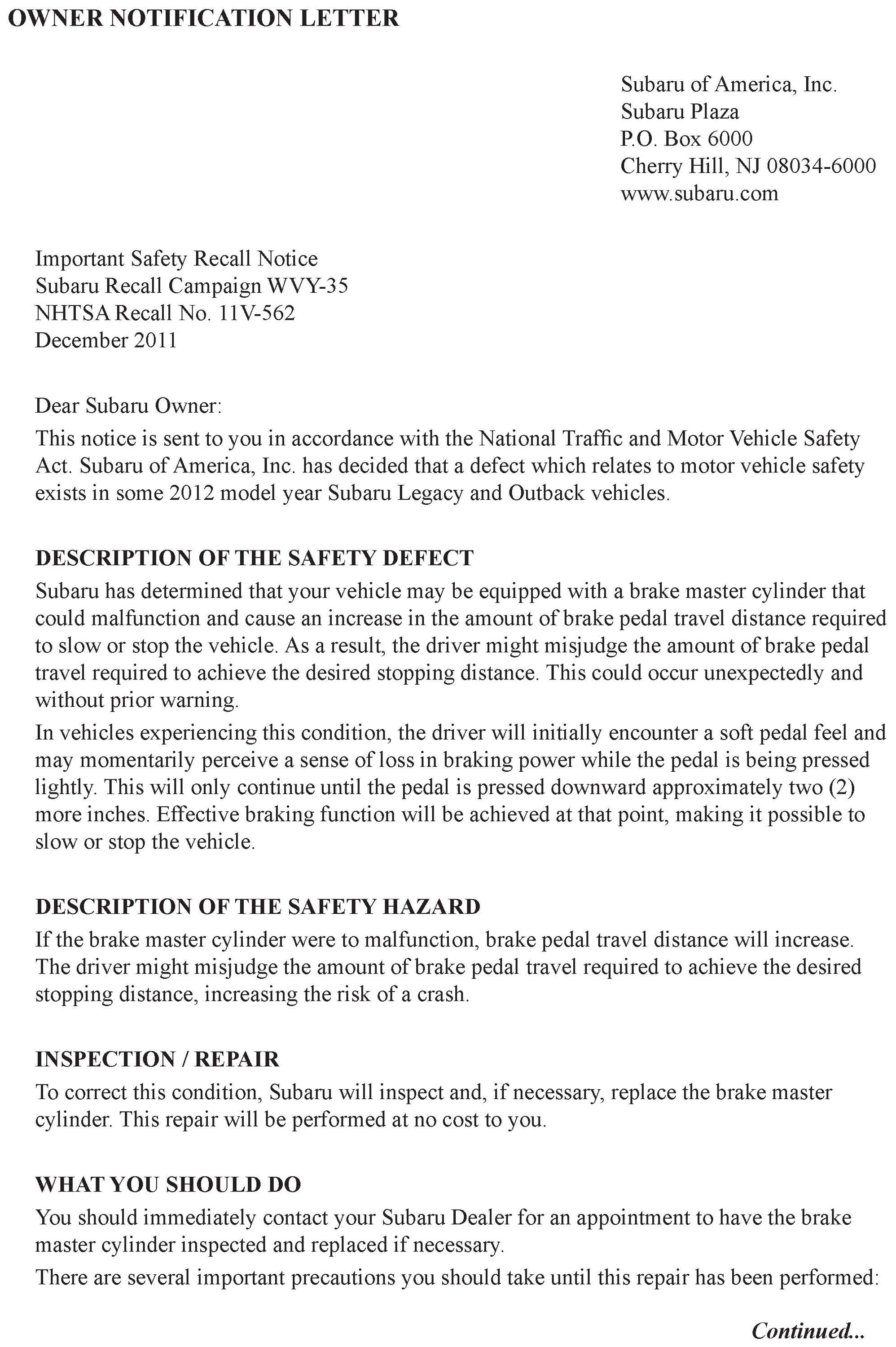 Subaru of America, Inc has determined that certain 2012 Legacy/Outback and Impreza (except WRX & STI) models may be equipped with a brake master cylinder that could malfunction and cause an increase in the amount of brake pedal travel distance required to slow or stop the vehicle. As a result, the driver might misjudge the amount of brake pedal travel required to achieve the desired stopping distance. This could occur unexpectedly and without prior warning.