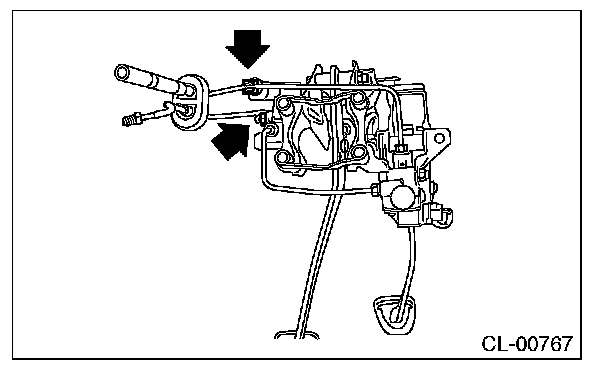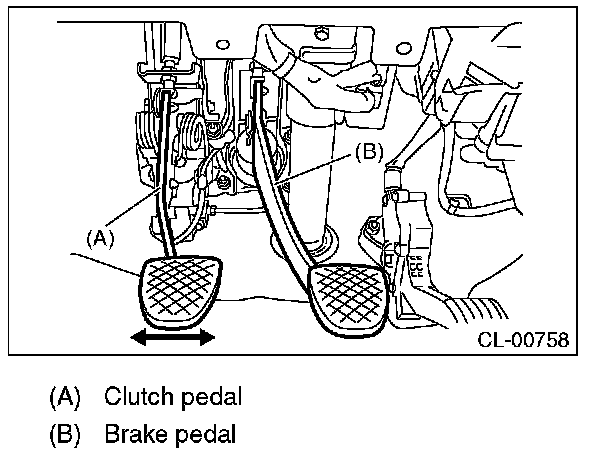 2) Depress and release the clutch pedal two or three times to ensure that the clutch pedal and release lever operate smoothly. If the clutch pedal and release lever do not operate smoothly, bleed air from the clutch hydraulic system.