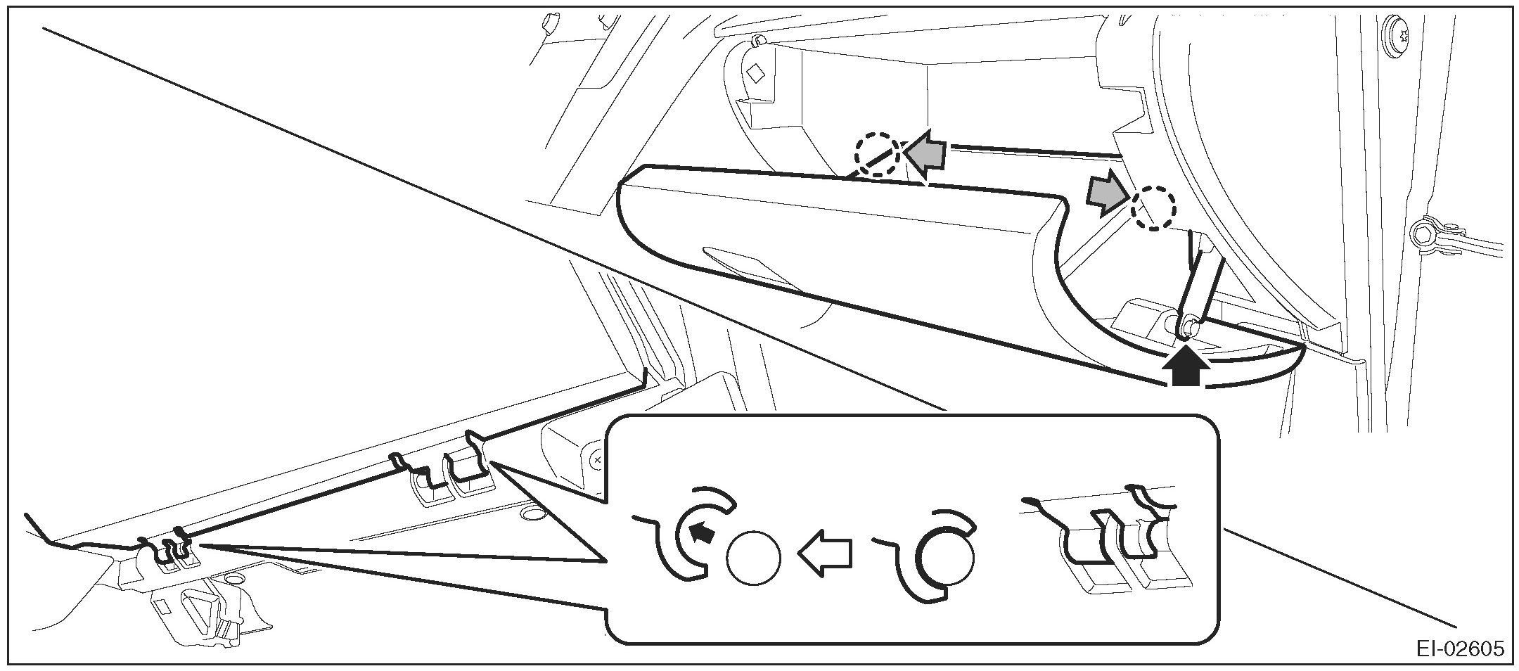 2. Release the stoppers and remove the glove box lid assembly by pulling it toward you.