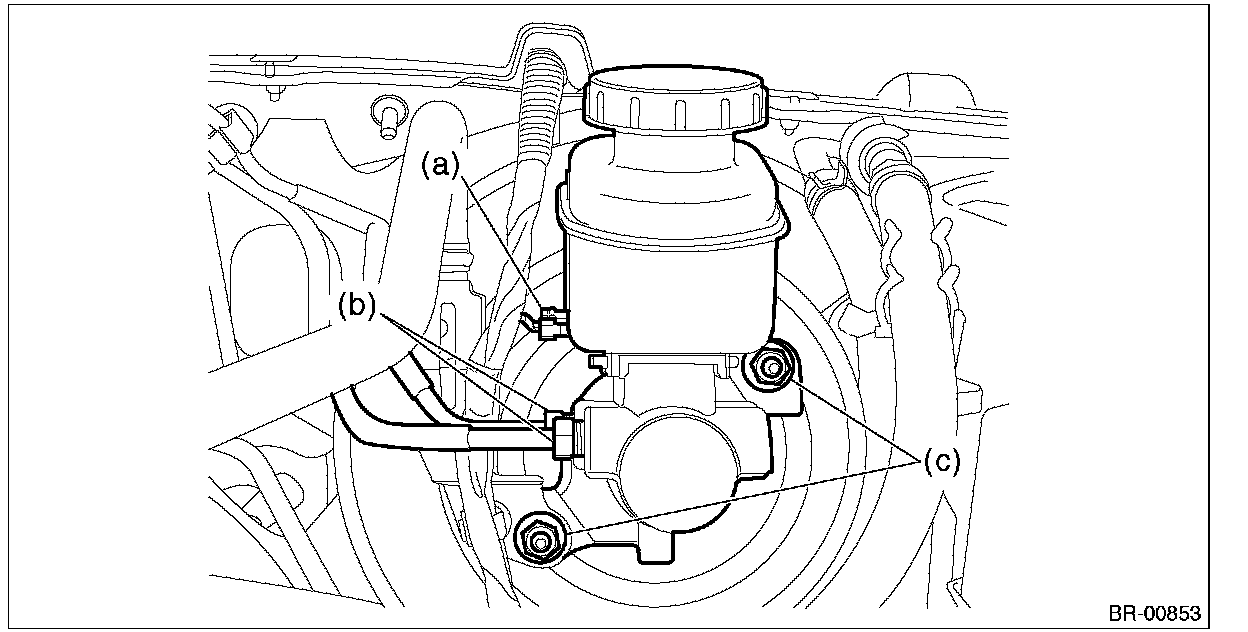 (3) Remove the nut (c), and slowly remove the master cylinder from the brake booster.
