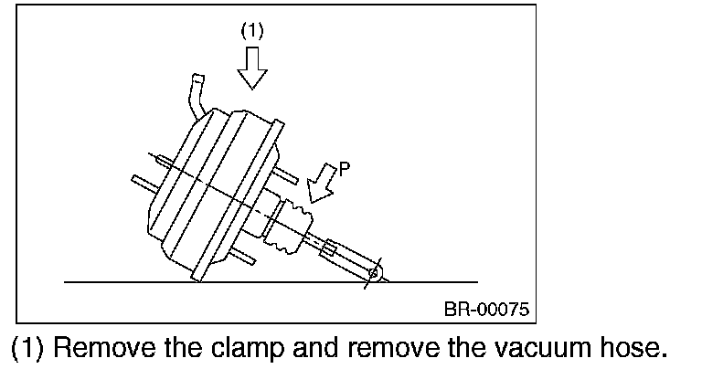 ^ If external force (1) is applied from above when brake booster is placed in this position, the resin portion as indicated by "P" may become damaged.