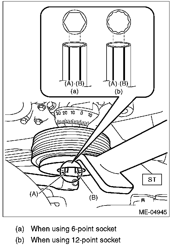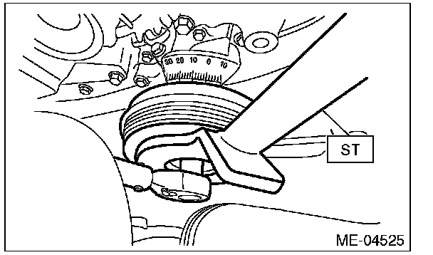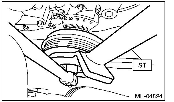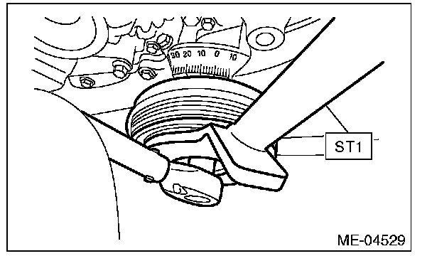 2) Use the ST to lock the crank pulley, and remove the crank pulley bolt.
