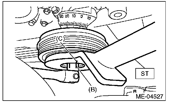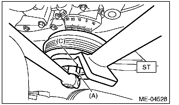 (4) Use the ST to lock the crank pulley, and tighten the crank pulley bolt to the angle where reference line (A) and end line (C) are aligned.
