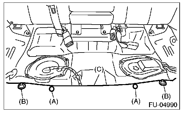 22. Set the floor mat (C), and install clips (A) and seat cushion hooks (B).