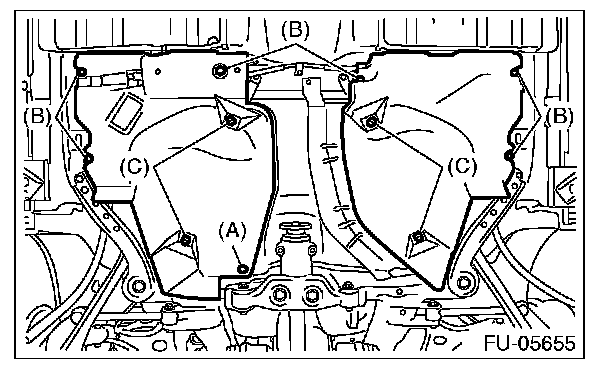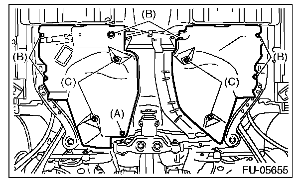20. Remove the bolts (B) and nuts (C) securing the fuel tank protector, and remove the fuel tank protector.