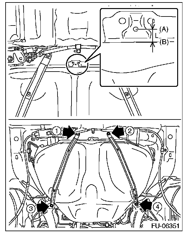 5. Move the fuel tank so that the distance between the center of the positioning hole for the body (A) and the front end of the fuel tank flange (B) becomes L, and tighten the bolts of the fuel tank bands in the sequence shown in the figure.
