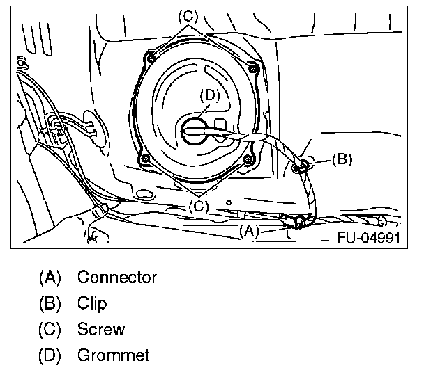 3. Push the grommet (D) down and remove the service hole cover.