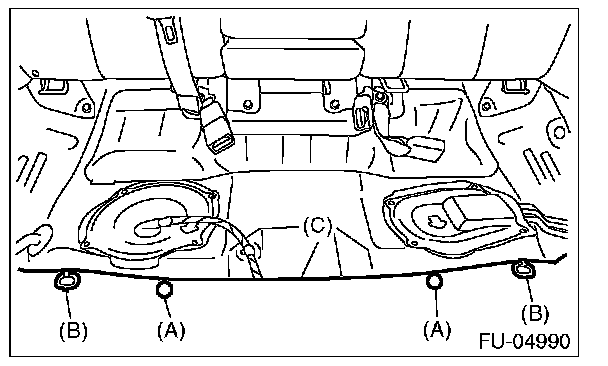 5. Remove the clips (A) and seat cushion hooks (B), and turn over the floor mat (C).