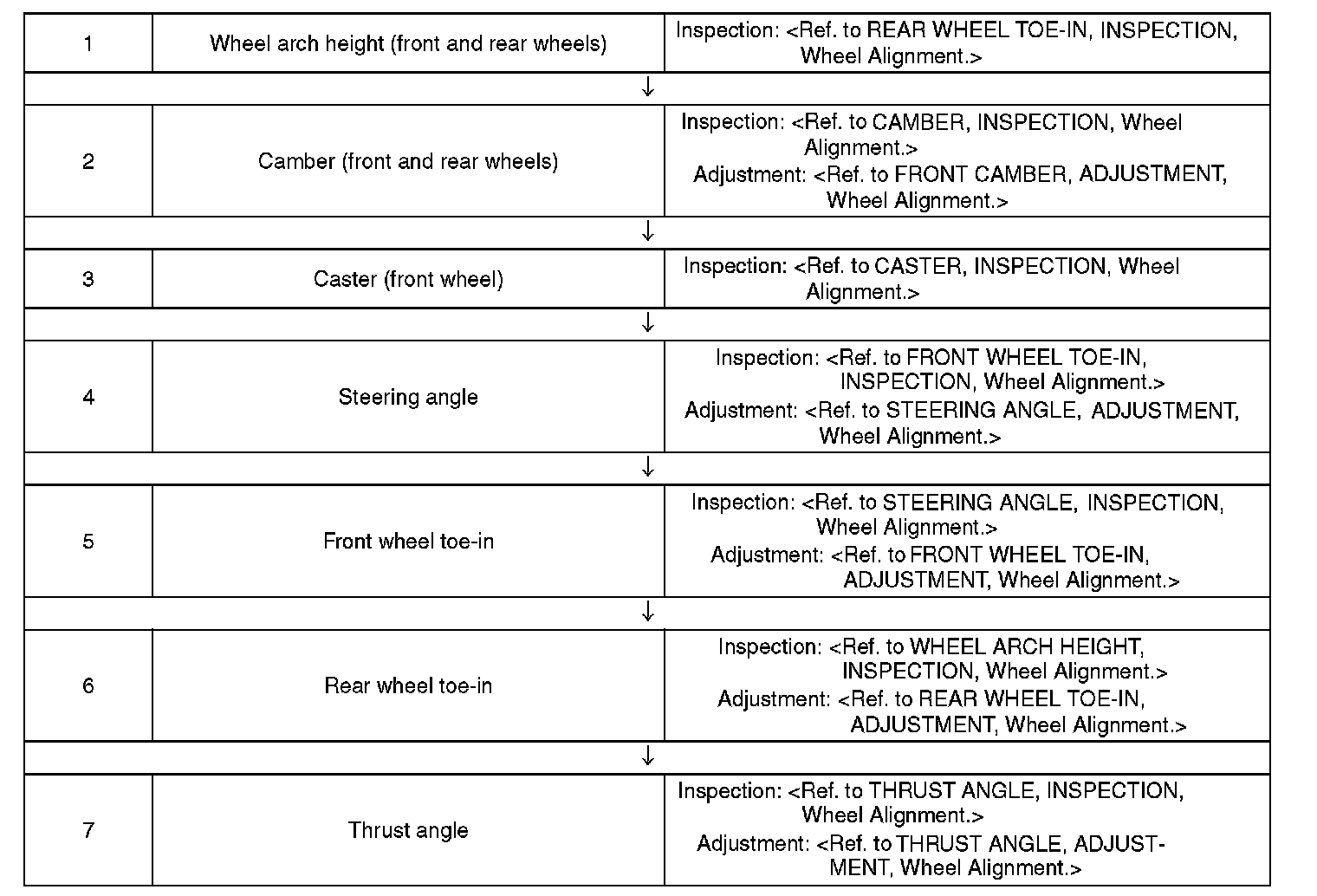 Check, adjust and measure the wheel alignment in accordance with the following procedures.