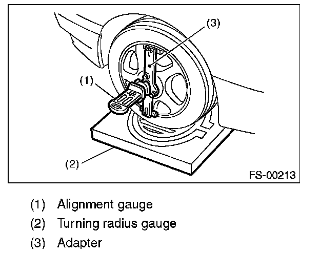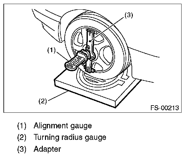 1) Place the front wheel on the turning radius gauge. Make sure the ground contact surfaces of the front and rear wheels are at the same height.