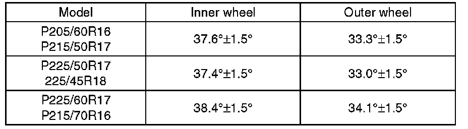 3) With the steering wheel held at each fully turned position, measure both the inner and outer wheel steering angles.