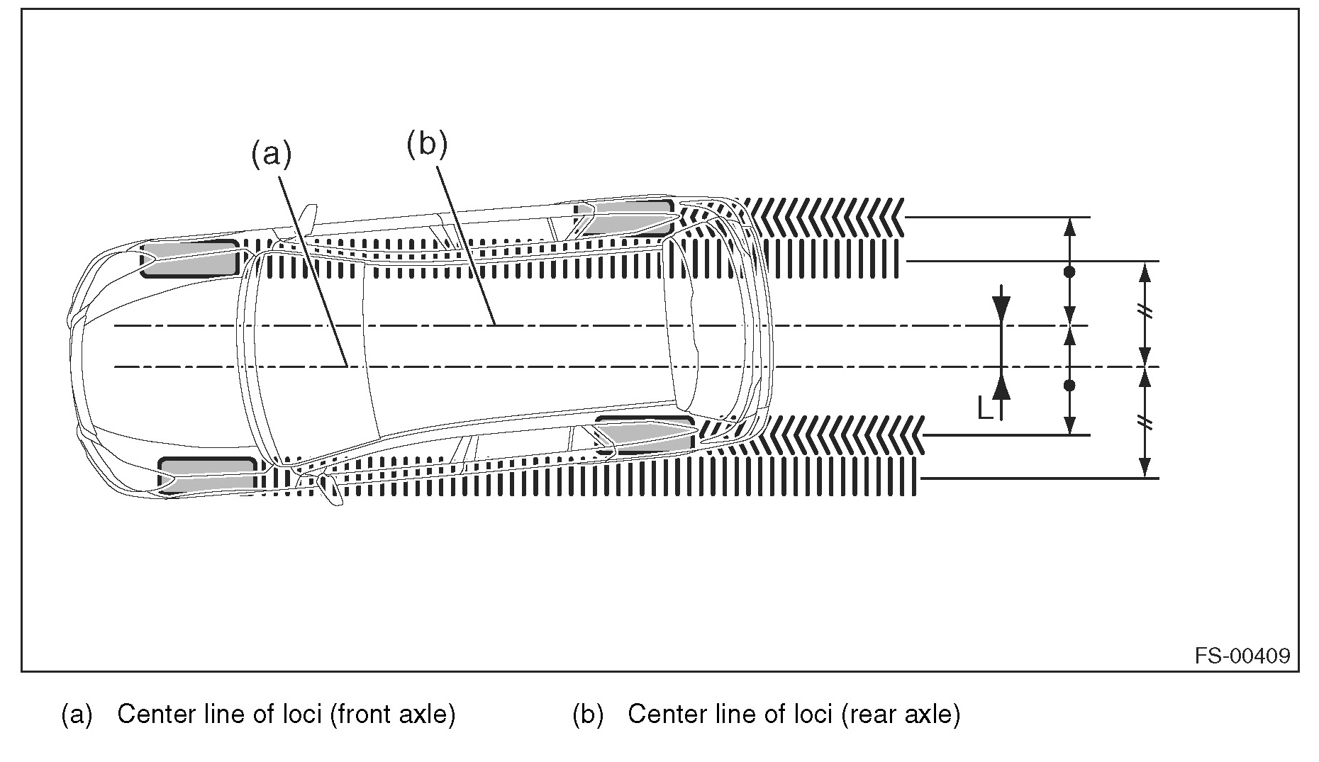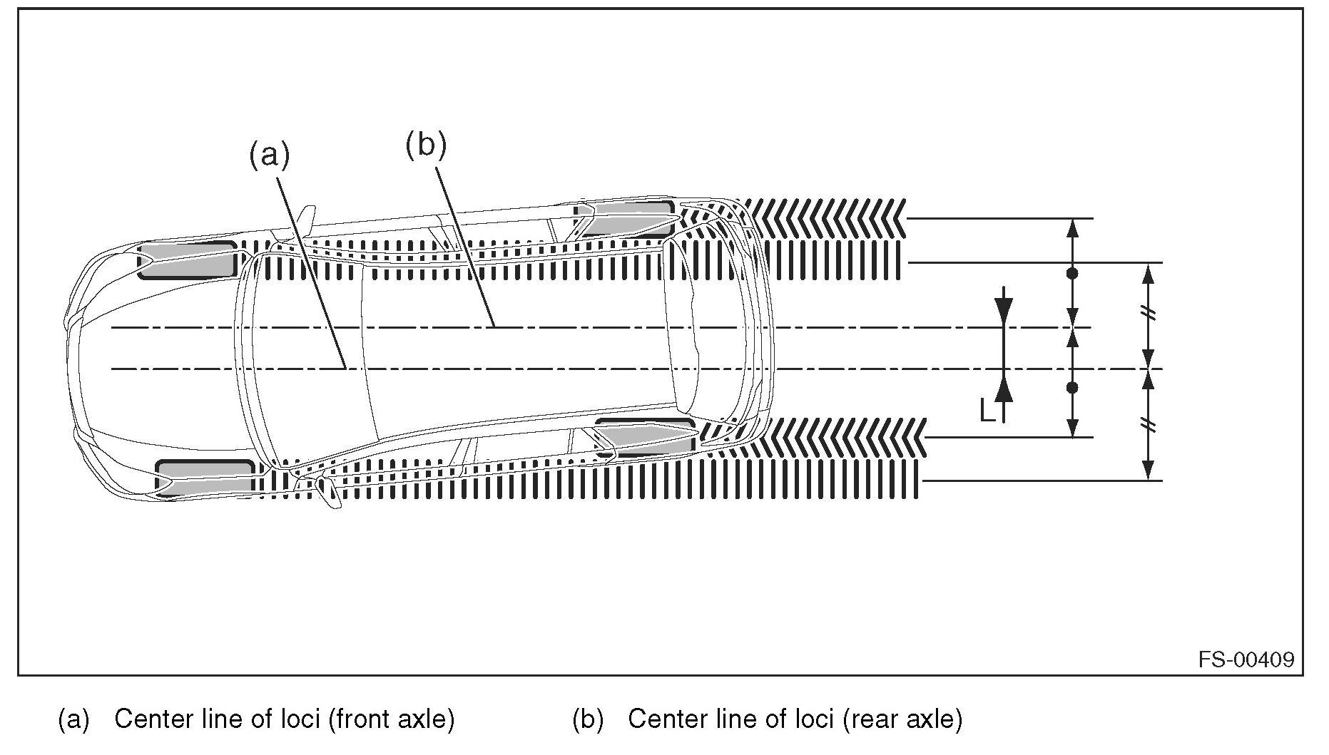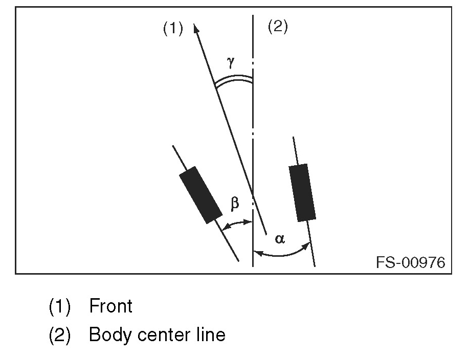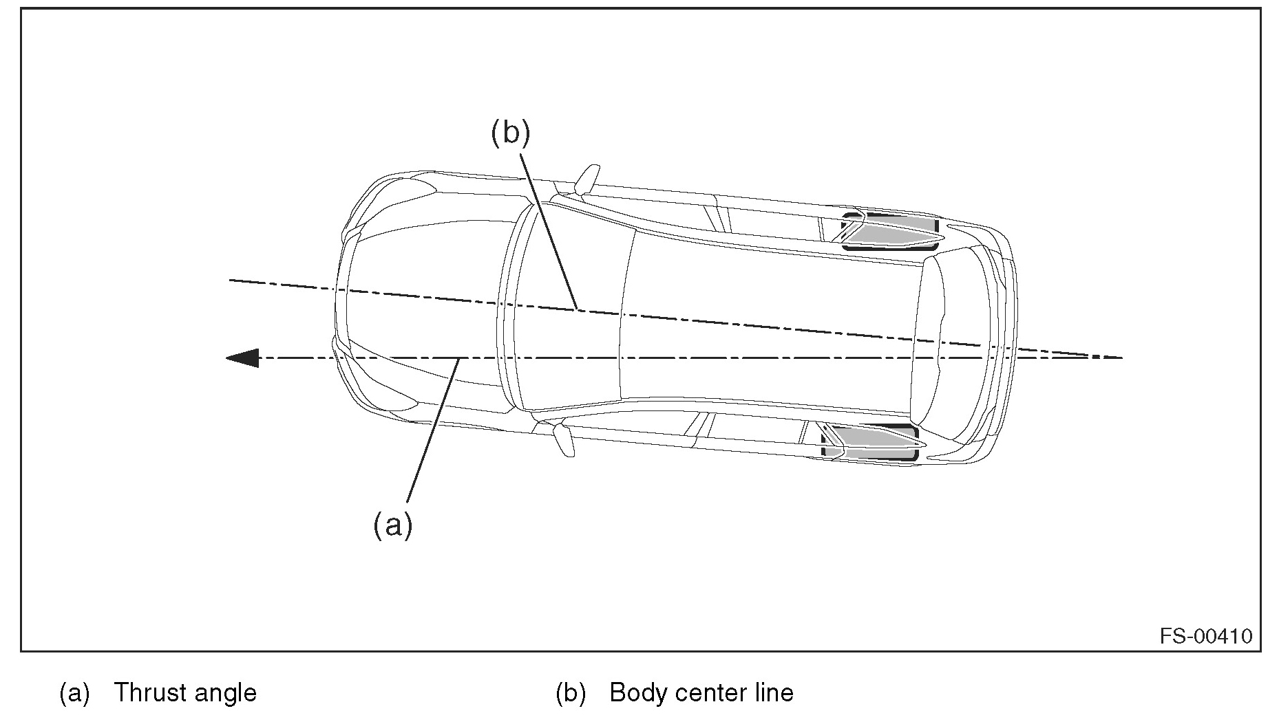 Thrust angle is a mean value of left and right wheel toe angles in relation to the vehicle body center line. Vehicle is driven straight in the thrust angle direction while slanting in the oblique direction depending on the degree of the mean thrust angle.