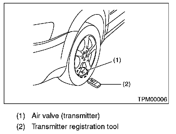 7) Contact the transmitter registration tool to the side wall area near the air valve on the front left tire, and press the switch. The transmitter ID is sent to the TPMS & keyless entry control module. (At that time, the tire pressure warning light blinks to confirm that the registration has started.)