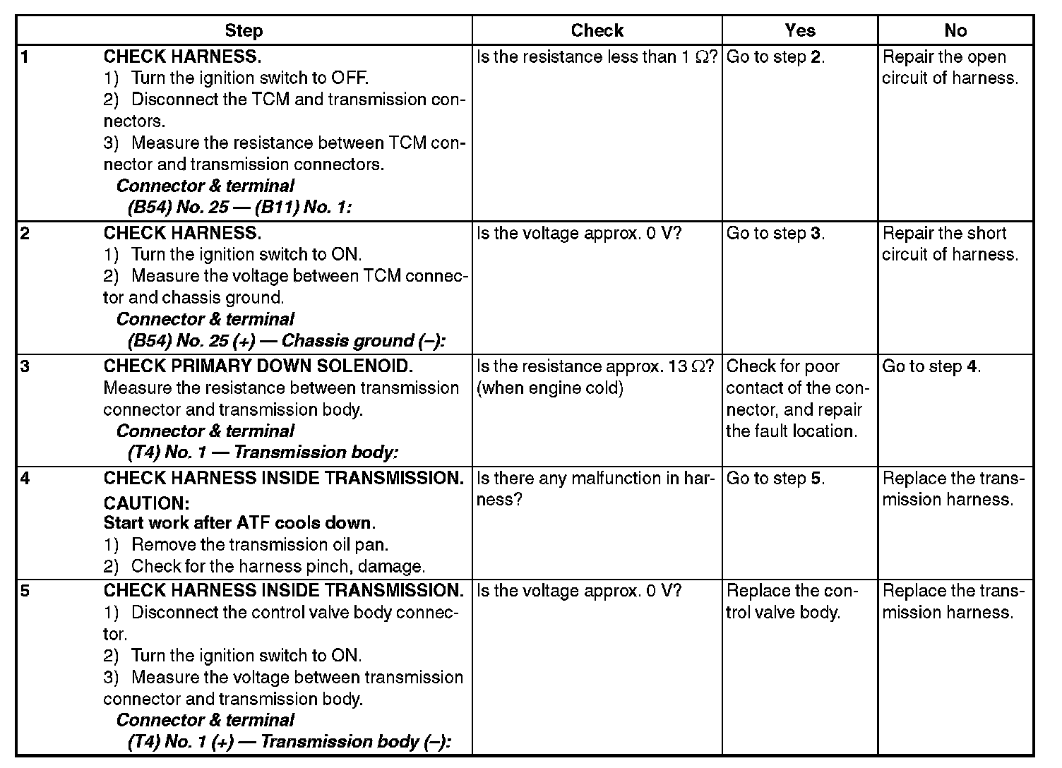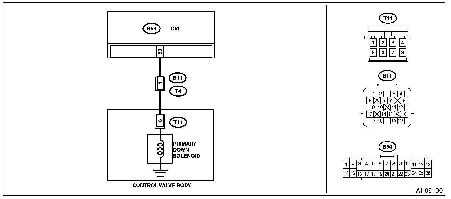 Output signal circuit of primary DOWN solenoid is open or shorted.
