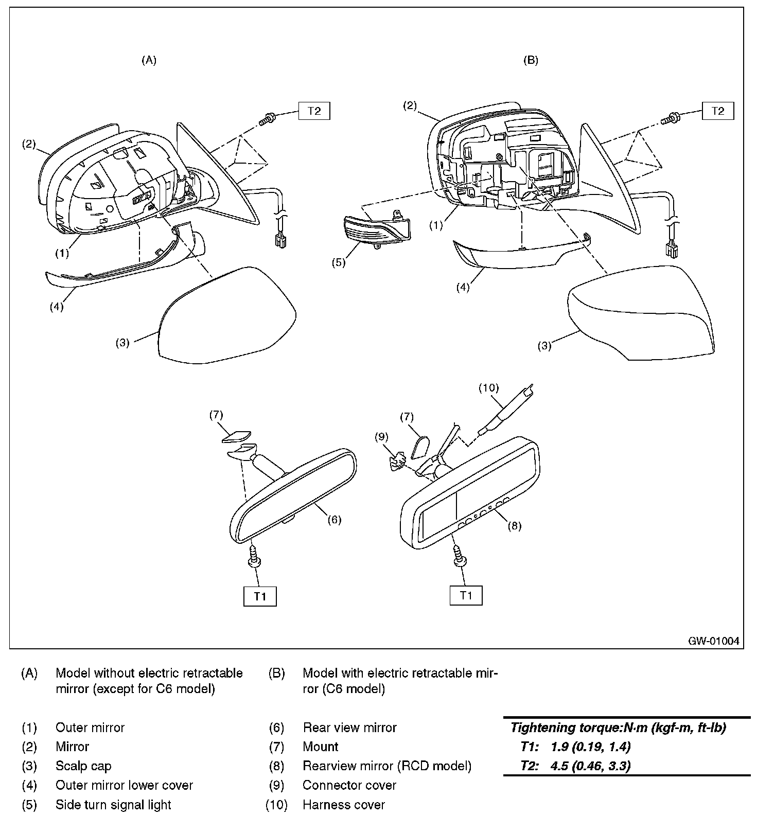 Outer mirror assembly: 4.5 N.m (0.46 kgf-m, 3.3 ft-lb).