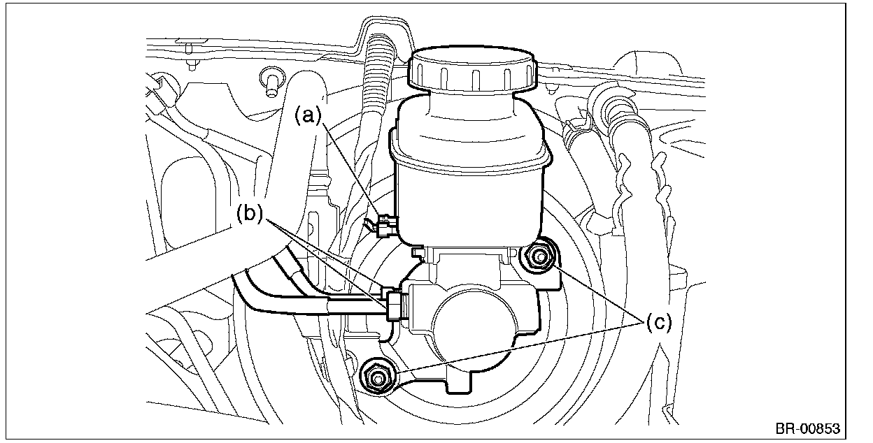 (3) Remove the nut (c), and slowly remove the master cylinder from the brake booster.