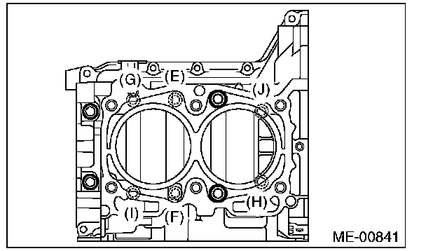 10) Tighten the RH side cylinder block connecting bolts (E - J) further in alphabetical order.