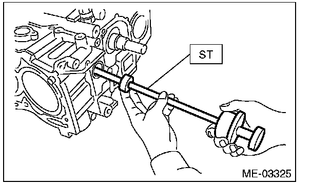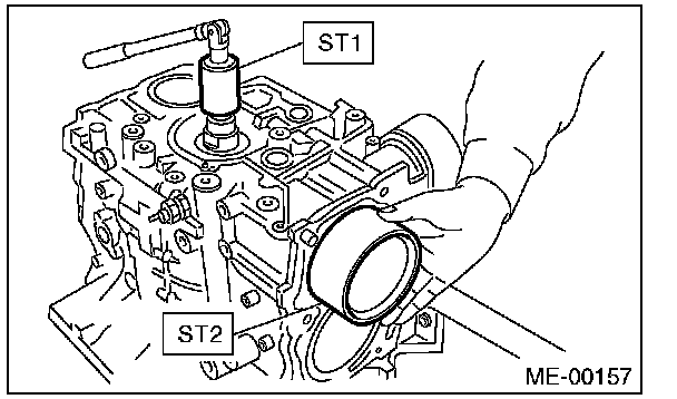 12) Apply a coat of engine oil to the oil seal inner periphery and outer periphery, and install the rear oil seal using ST1 and ST2.