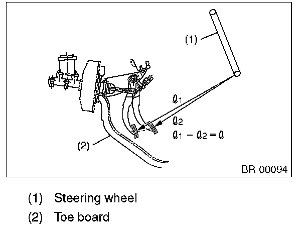Run the engine at idle after warming up the engine, and depress the brake pedal with a force of 500 N (51 kgf, 112 lbf). Measure the distance between the brake pedal and steering wheel. Release the pedal, and measure the distance between pedal and steering wheel again.