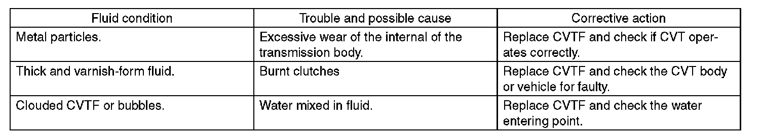 When replacing CVTF, determine the condition inside the transmission body by inspecting the drained CVTF.