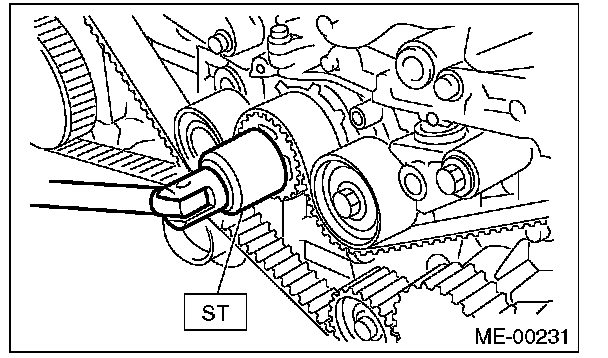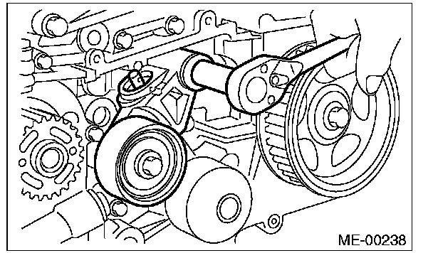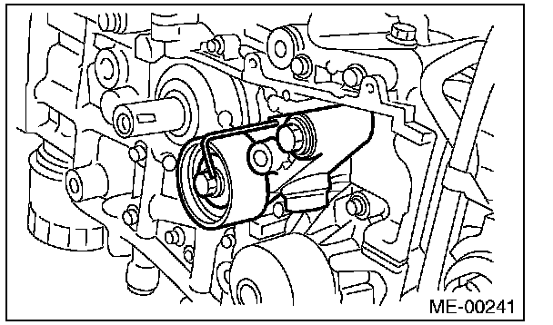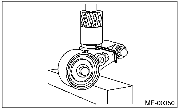 2) Check the belt tension pulley for smooth rotation. Replace the automatic belt tension adjuster assembly with a new part if abnormal noise or excessive play occurs.