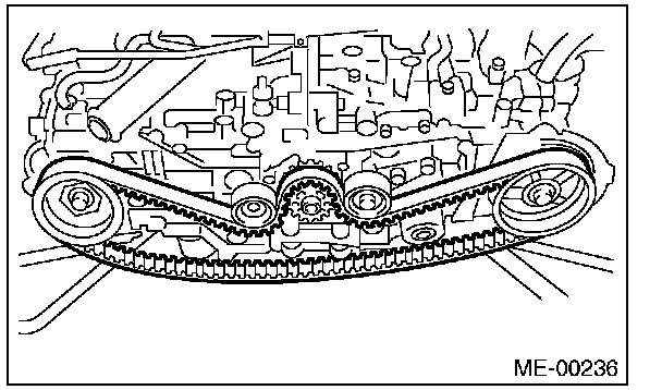 2) Check the condition on the back surface of the timing belt. If cracks are found, replace the timing belt.